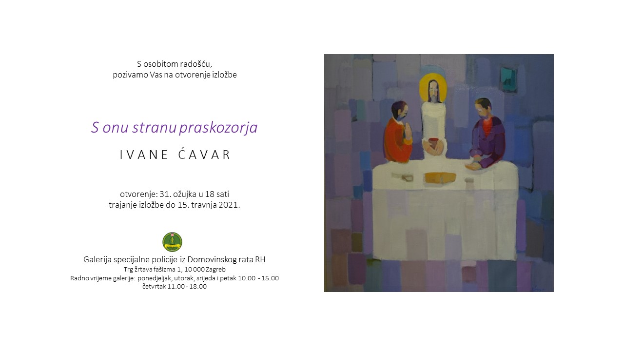 Izložba pod nazivom "S onu stranu praskozorja" uvodi nas u ozračje iščekivanja najvećeg kršćanskog blagdana – Uskrsa. Akademska slikarica Ivana Ćavar na svojim uljima na platnu donosi niz tradicionalnih motiva teološke tematike vezane uz Kristovo uhićenje, muku, smrt i uskrsnuće prikazanih kroz prizmu suvremene interpretacije – reduciranim formama likova i fasetiranim pozadinama. Izložba uz ciklus 14 postaja križnog puta obuhvaća i niz drugih vrlo poznatih scena vezanih uz Kristove posljednje dane i Kristovo uskrsnuće pri čemu se na tankoćutno naslikanim prizorima istovremeno ističu Kristova božanska i ljudska dimenzija kao neraskidivo jedinstvo na kojem počiva temelj kršćanske vjere.